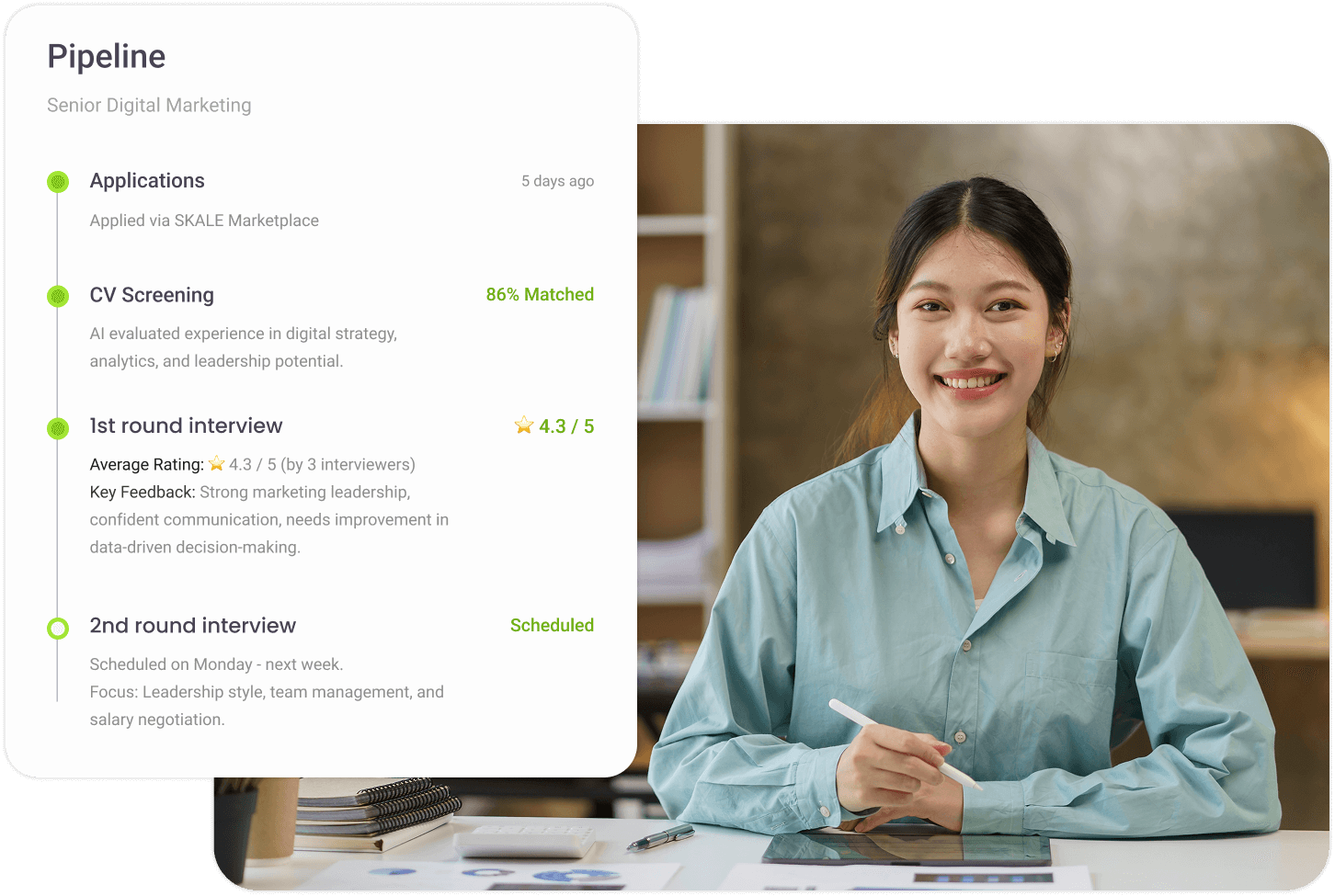 AI của SKALE tự động đọc CV từ nhiều định dạng (PDF, Word...), trích xuất và nhập dữ liệu chính xác vào hệ thống, giúp loại bỏ nhập liệu thủ công và tăng tốc quy trình tuyển dụng.