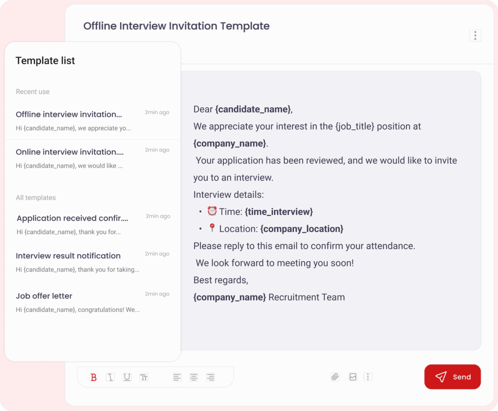 Tự động thiết lập lịch và gửi lời mời đến ứng viên, phỏng vấn viên mà không cần dùng công cụ ngoài, giúp quy trình diễn ra mượt mà và chuyên nghiệp.