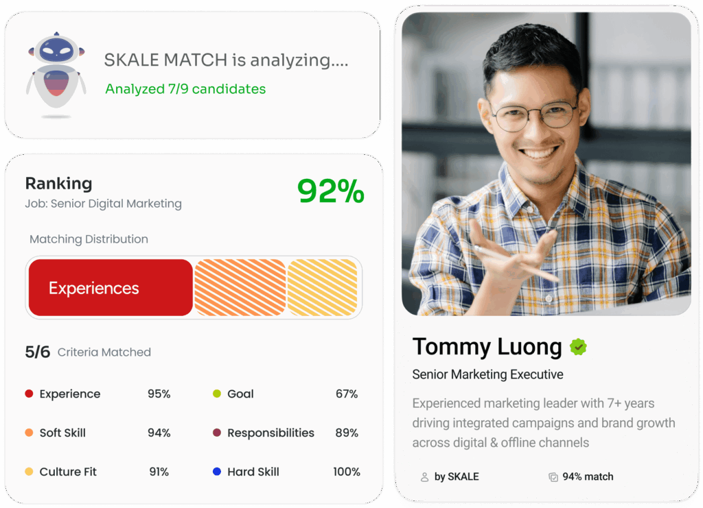 Tự động sàng lọc, xếp hạng và đề xuất ứng viên phù hợp công việc lẫn văn hóa doanh nghiệp, giúp tiết kiệm tối đa thời gian tuyển chọn